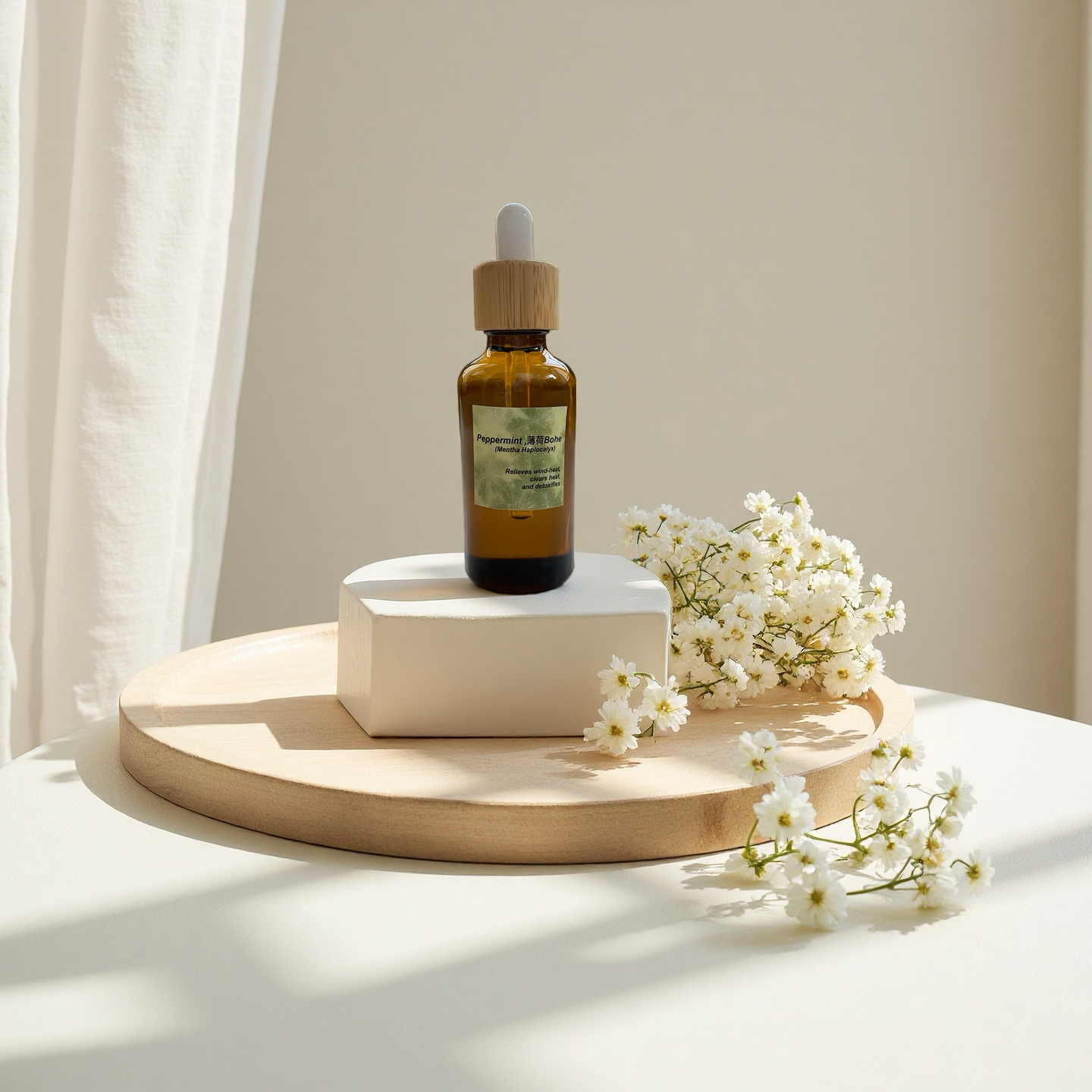 Peppermint essential oil relieves dizziness with headache, clears heat, disperses wind, and calms the mind. Applied to Shixuan (EX-UE9), Taiyang (EX-HN5), Fengchi (GB20) acupoints for optimal effect.